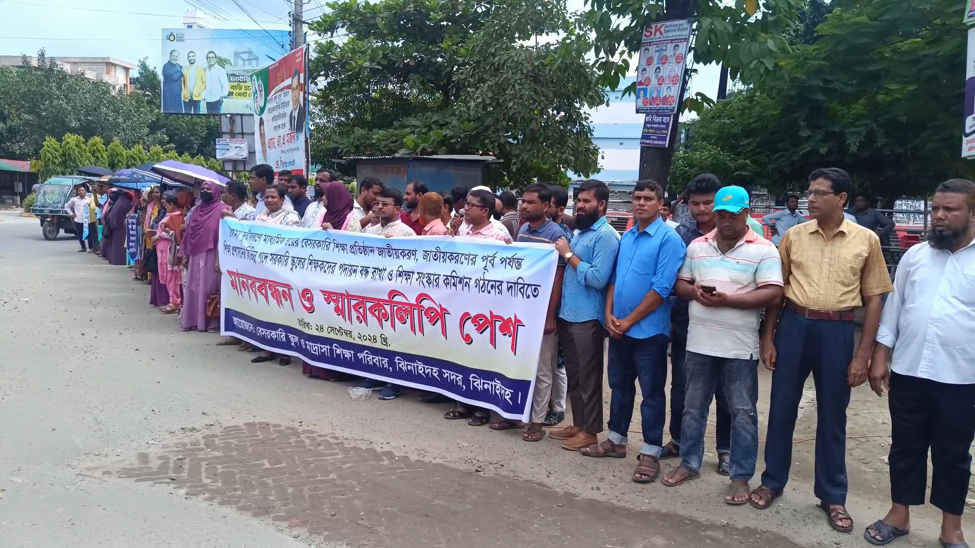বৈষম্য দূরীকরণে মাধ্যমিক স্তরের শিক্ষা প্রতিষ্ঠান জাতীয়করণ, জাতীয়করণের পূর্ব পর্যন্ত শিক্ষা প্রশাসনের বিভিন্ন পদে সরকারি স্কুলের শিক্ষকদের পদায়ন বন্ধ রাখা ও শিক্ষা সংস্কার কমিশন গঠনের দাবীতে ঝিনাইদহে মানববন্ধন কর্মসূচী পালিত হয়েছে।
