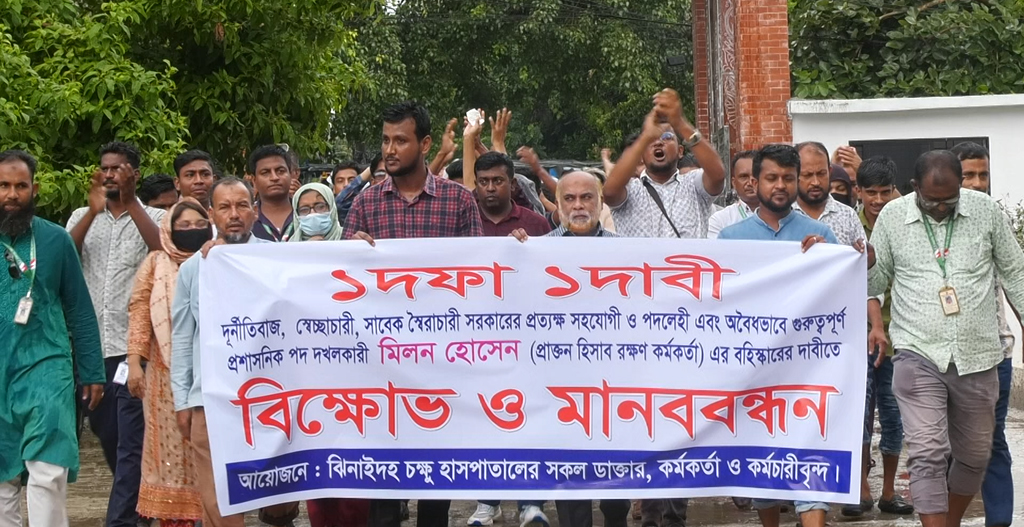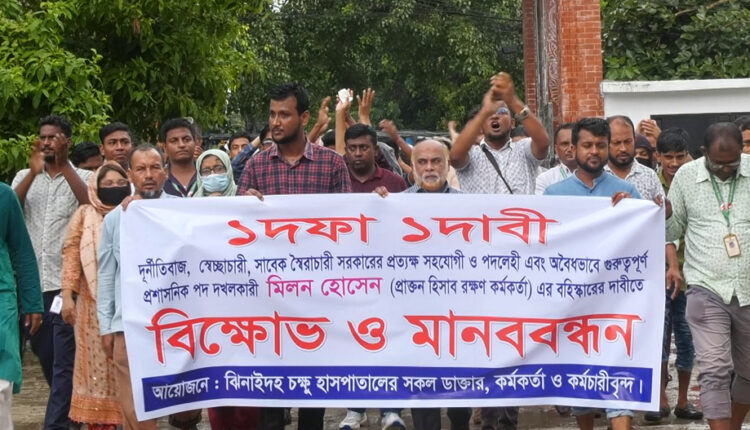 ঝিনাইদহ চক্ষু হাসপাতালের সহকারি পরিচালক মিলন হোসেন বহিস্কারের দাবীতে বিক্ষোভ মিছিল ও মানববন্ধন কর্মসূচি পালন করেছে হাসপাতালের চিকিৎসক, কর্মকর্তা ও কর্মচারীরা।